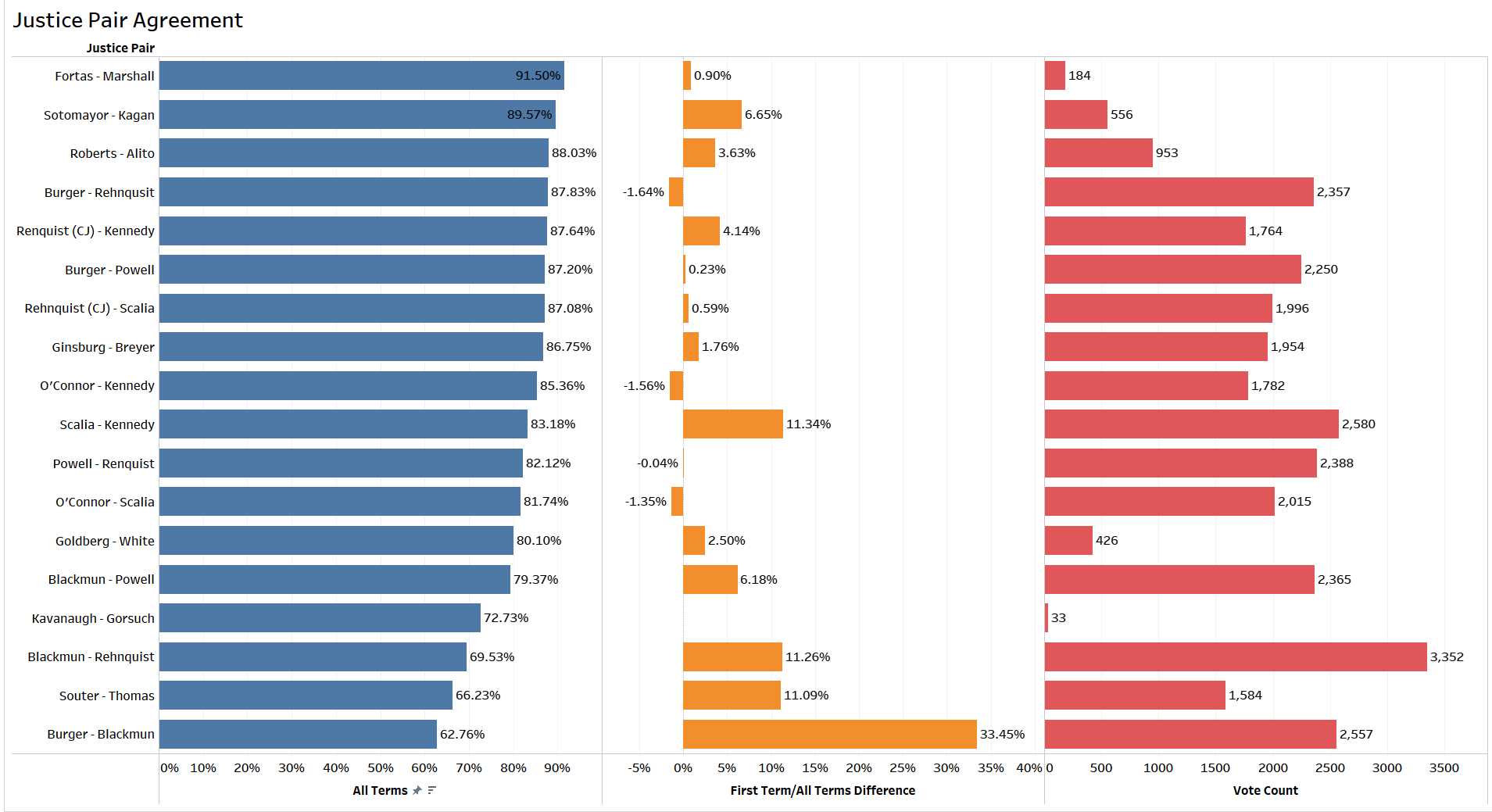 Most of the justice pairings had slight differences in agreement levels from their first terms on the Court. Four pairs that had significant disparities were Burger and Blackmun (they voted together 33.45% more frequently in their first term together), Scalia and Kennedy, Blackmun and Rehnquist, and Souter and Thomas. Time will tell if Gorsuch and Kavanaugh end up towards the top or bottom of these percentages and to what extent their career numbers differ from those in this, their first term together on the Court.