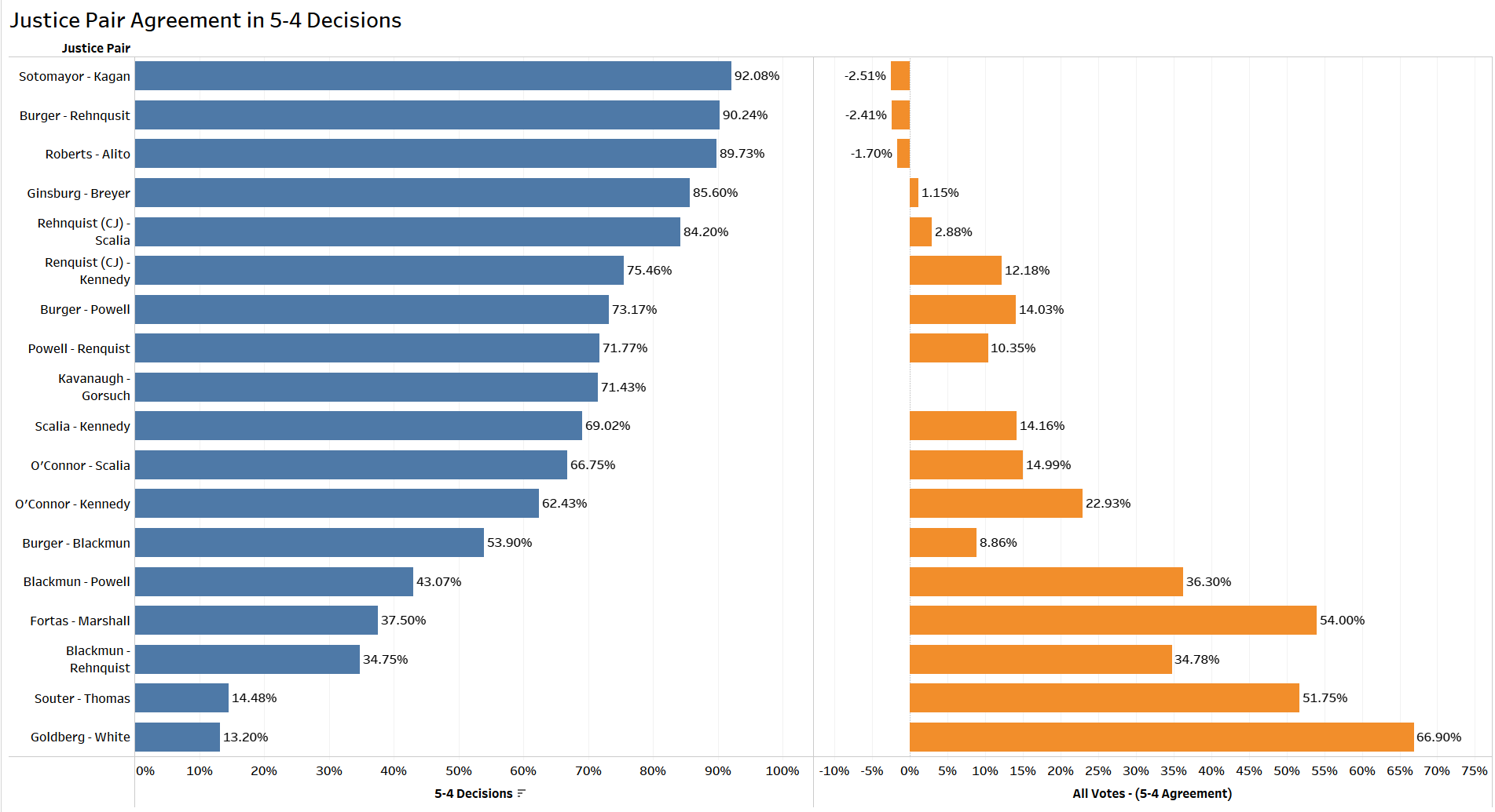 So far, Kavanaugh and Gorsuch fall to the middle of this list based on agreement in 5-4 decisions. Two pairs with the highest levels of agreement in 5-4 decisions — Alito and Roberts, and Sotomayor and Kagan — are at the top of this list. Even though both pairs are at the top, their voting agreements in all cases are actually higher in the aggregate than in their 5-4 decisions. On the other end of the spectrum, Goldberg and White and Thomas and Souter showed that even though they had low overall relative voting agreement rates, their agreement in 5-4 cases was substantially lower.