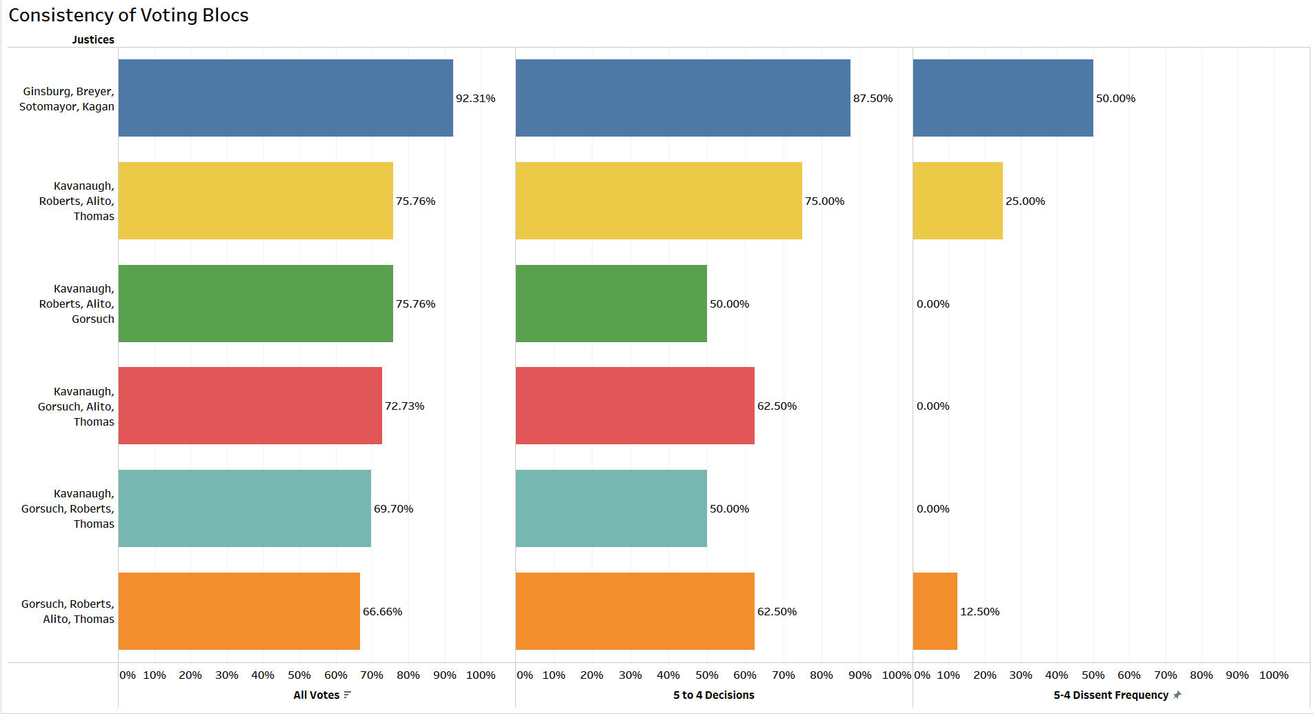 So far the liberals were in voting agreement over 16% more of the time than any combination of the more conservative justices. The liberals’ agreement rate actually drops a bit for 5-4 decisions (a good example of surprising voting coalitions that led to these fractures was in Stokeling v. U.S. where Roberts was in dissent with all liberals except for Breyer who was in the majority with the remaining four conservatives). The conservative grouping with the lowest voting agreement frequency so far this term is the one composed of the justices aside from Kavanaugh although Kavanaugh, Gorsuch, Roberts, and Thomas have voted together in less than 70% of the Court’s decisions so far this term. The coalitions’ agreement levels in 5-4 dissents are also notable with 50% or four of eight of the dissents coming from the liberal bloc, and 25% or two of eight from Kavanaugh, Roberts, Alito, and Thomas.