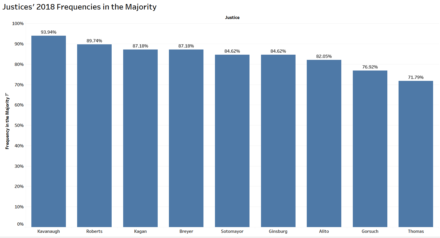 Even looking at the other justices’ first full terms (Thomas in 1991, Alito in 2006, and Gorsuch in 2017), Kavanaugh would have the highest frequency in the majority if he keeps this rate up for the remainder of the term.