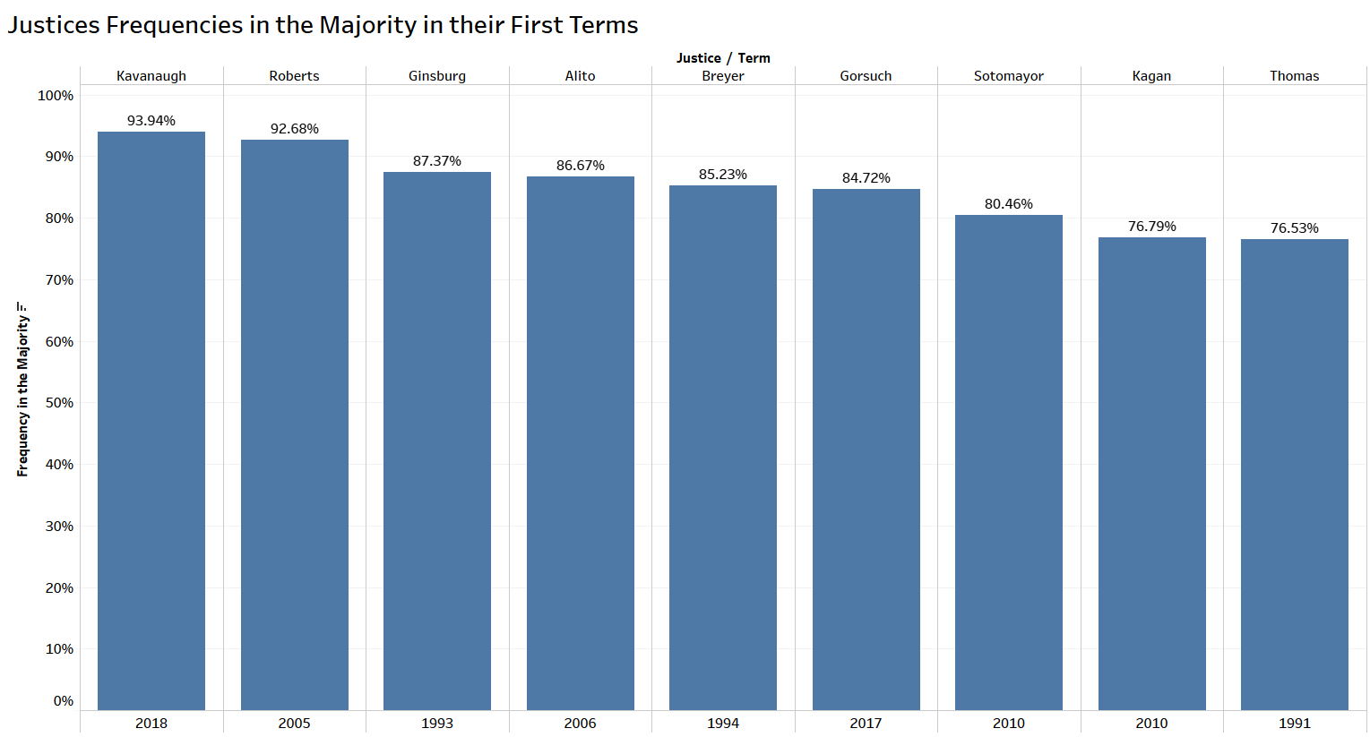 Roberts is the only sitting justice with over 90% frequency in the majority in his first full term on the Court.