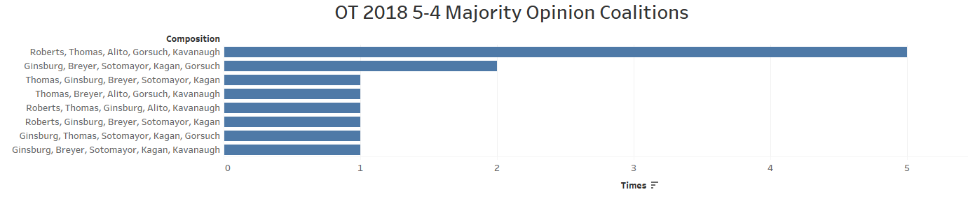 Finally the diversity of authorship in 5-3 and 5-4 decisions is also readily apparent. With Kennedy no longer taking the bulk of these opinion assignments, these opinions are split more evenly among the justices. Thomas authored the most such decisions so far this term with four and Kavanaugh is the only other justice authoring more than one 5-4 or 5-3 majority opinion (he authored two so far), while the remaining seven other justices each authored one such decision apiece.