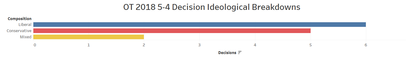 Although the tactics for securing this fifth vote may have led the liberals to account for more diverse views in the majority opinions, they have also led to a higher rate of success in these cases than many expected prior to the term. This is evident below as we break the 5-3 and 5-4 ideological compositions down for these 13 decisions.
