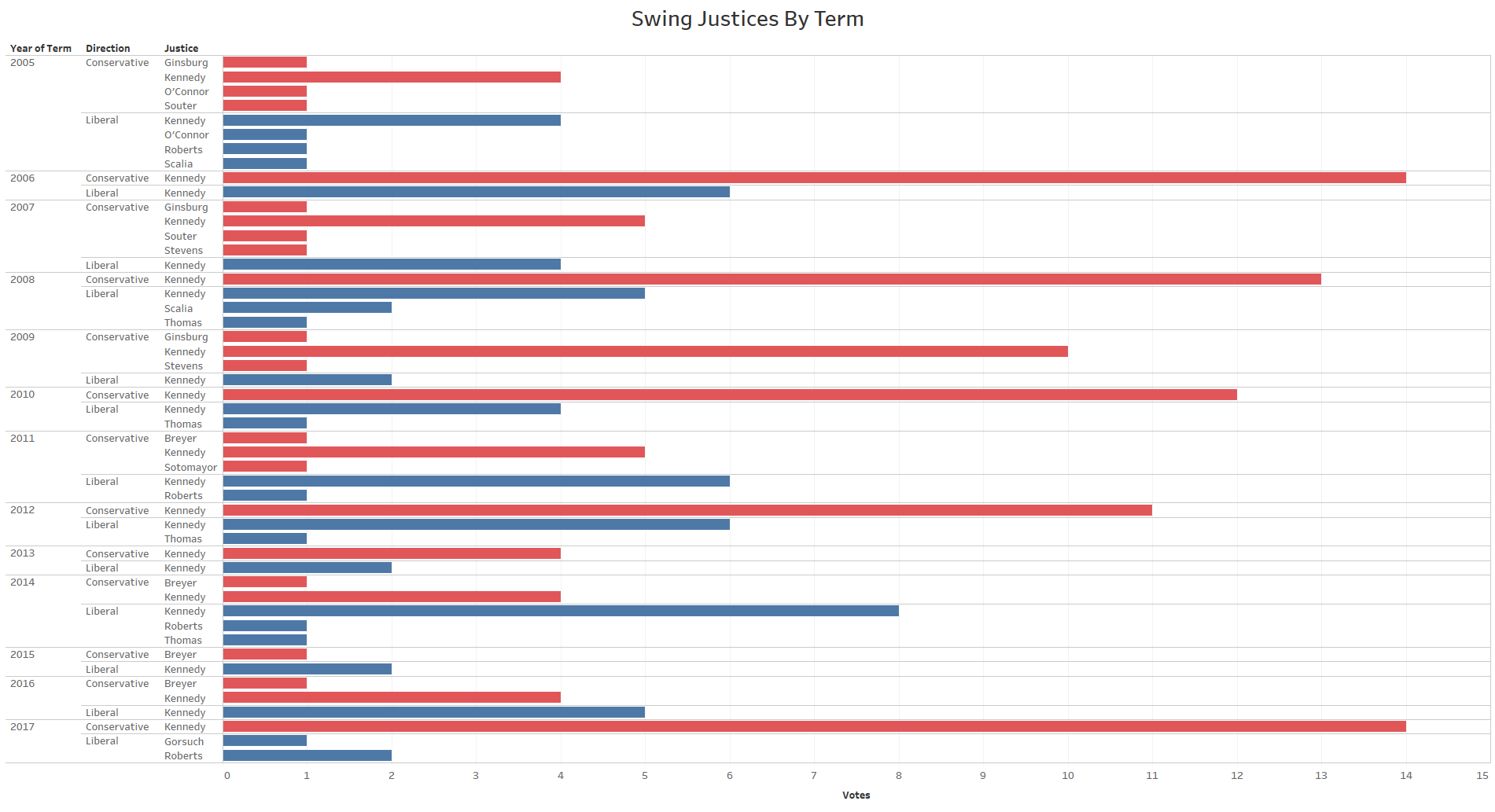These swing justices are defined as follows: the more conservative coalitions included Scalia, Thomas, Alito, and Roberts through the middle of the 2015 term, and then Gorsuch from the end of the 2016 term forward. A fifth justice voting alongside one of these groupings of four was noted as the swing. The more liberal coalitions included Souter, Stevens, Ginsburg, and Breyer until 2009, then Sotomayor, Stevens, Ginsburg, and Breyer in 2009, and Sotomayor, Kagan, Ginsburg, and Breyer for the 2010 term forward. Similar to the conservatives’ swing justices, a swing for the liberals voted along with one of these groupings of four liberal justices.