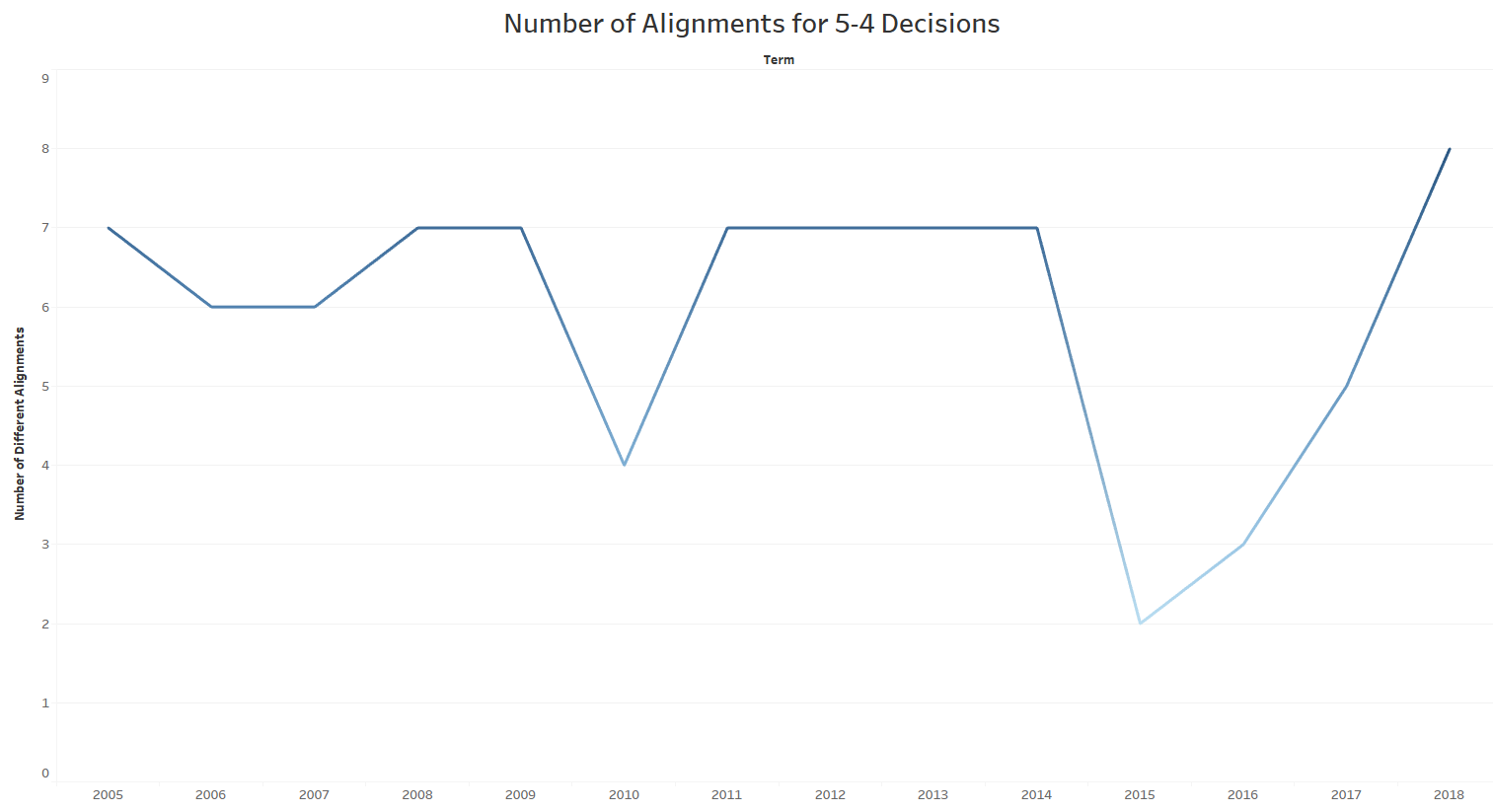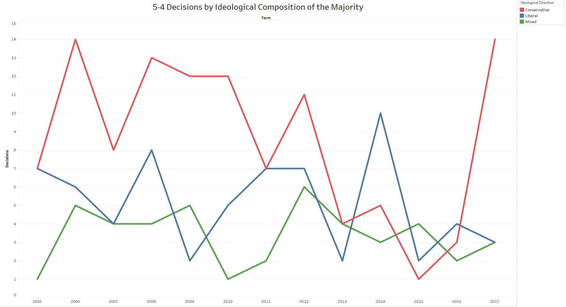 This can also be visualized by combining the justices into liberal, conservative, and mixed 5-4 and 5-3 coalitions for the 2005 through 2017 terms. When organized in this fashion the graph looks as follows: