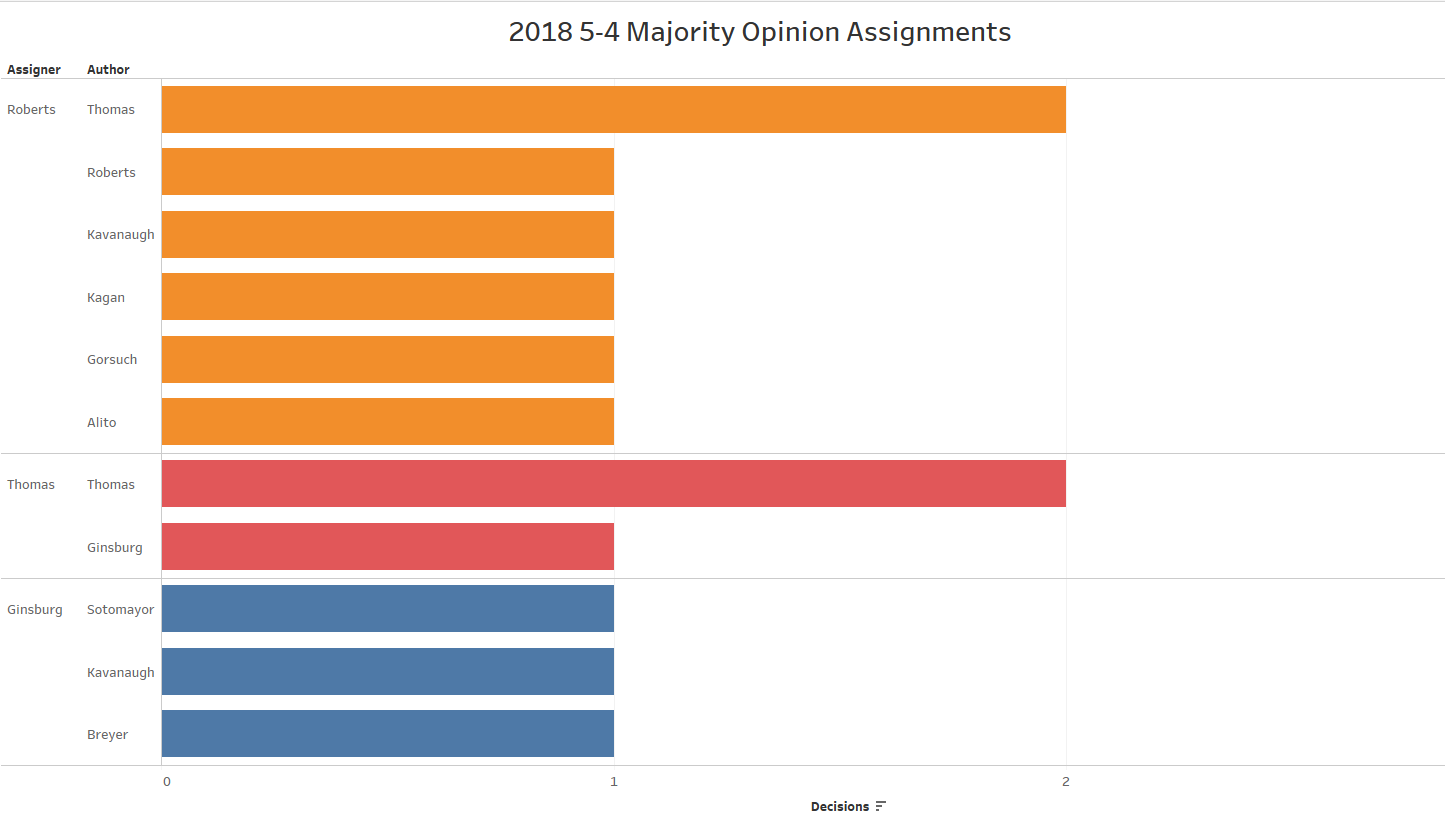 Two of Thomas’ decisions were self assigned and two were assigned by Roberts. Kavanaugh had one opinion assigned by Roberts and one by Ginsburg.