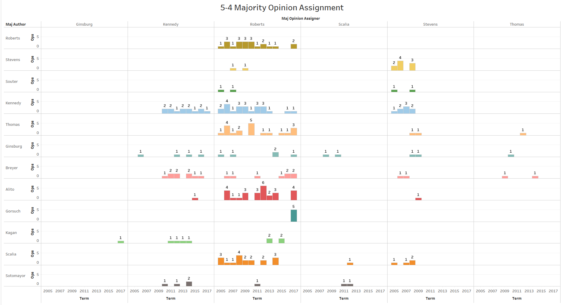 Looking at past opinion assignments during the Roberts Court years, we may note that Thomas has only assigned himself authorship of one 5-4 majority opinion prior to this term. This was in the 2012 decision Alleyne v. U.S. The horizontal axis below shows assigning justices (and terms on the bottom) while the vertical axis contains the authoring justices.