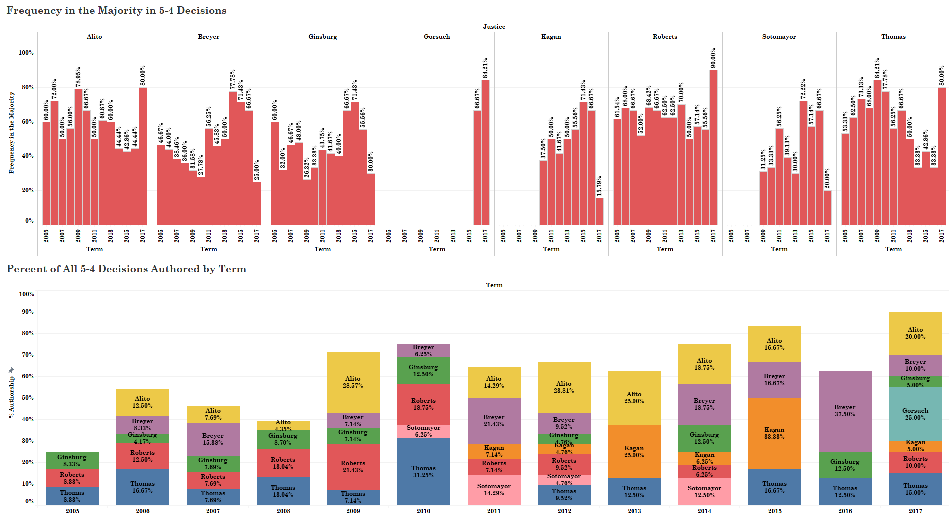Focusing on the fraction of majority opinions authored by each justice in 5-4 decisions out of all 5-vote majority decisions for the term, both Roberts and Thomas authored a greater percentage of such opinions than they have in previous Roberts Court terms at 36% and 33% respectively. Note that the justices no longer on the Court are not shown in this figure although their respective percentages (especially Kennedy’s) are what keeps the aggregate 5-4 decision authorship by term below 100%.