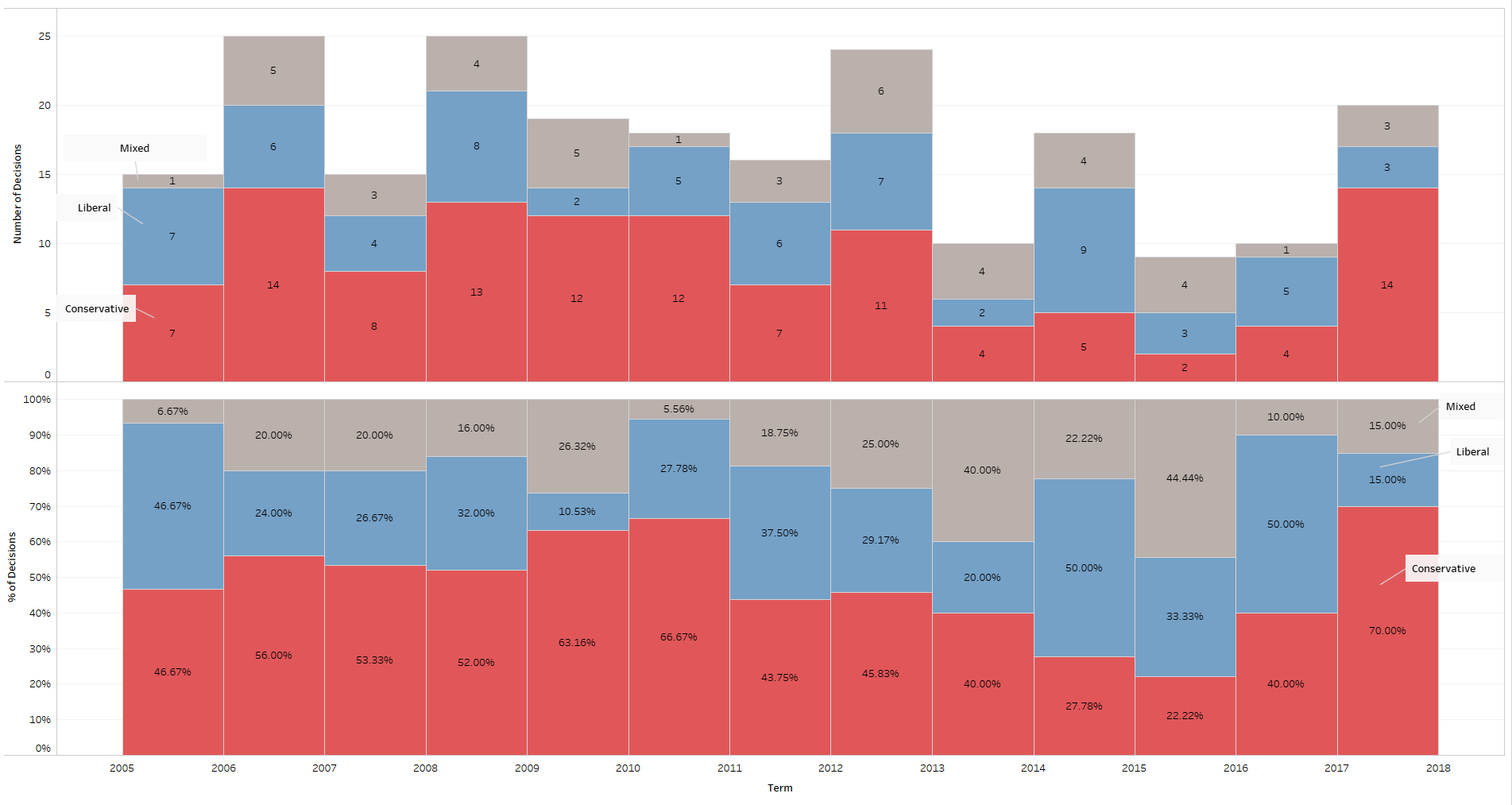 When we separate out the justices into coalitions in 5-4 decisions based on whether there were four liberal justices in the majority, at least four conservative justices in the majority, or a different mix of justices in the majority, we see that the greatest percentage of 5-4 decisions that went to liberal majorities in a term since 2005 was 50% in both the 2014 and 2016 terms. The greatest percentage that went to conservative coalitions was 70% during the last term.