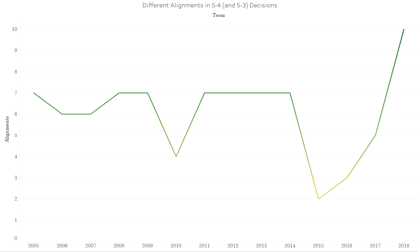 In past, Justice Kennedy played the role of “swing justice,” but since he retired at the end of last term, many Court watchers were unsure who, if anyone, would usurp this role. Although Kennedy’s retirement was sure to change the composition of a number of majority coalitions, it was unclear to what extent this would insulate the Court’s five more conservative justices in tight majorities. Interestingly, at the statistical level the Court took a step back from the domination of conservative justices in 5-4 decisions that we saw during the 2017 term. In 2017, all of the votes in 5-4 cases that split the justices ideologically went in the conservatives’ favor. By contrast, in the 2018 term less than 50% of the ideological split 5-4 decisions had the more conservative justices in the majority with the other portion including decisions with the four more liberal justices along with one conservative justice in the majority. This also led to a Roberts Court record in terms of the number of alignments in these 5-4 decisions.