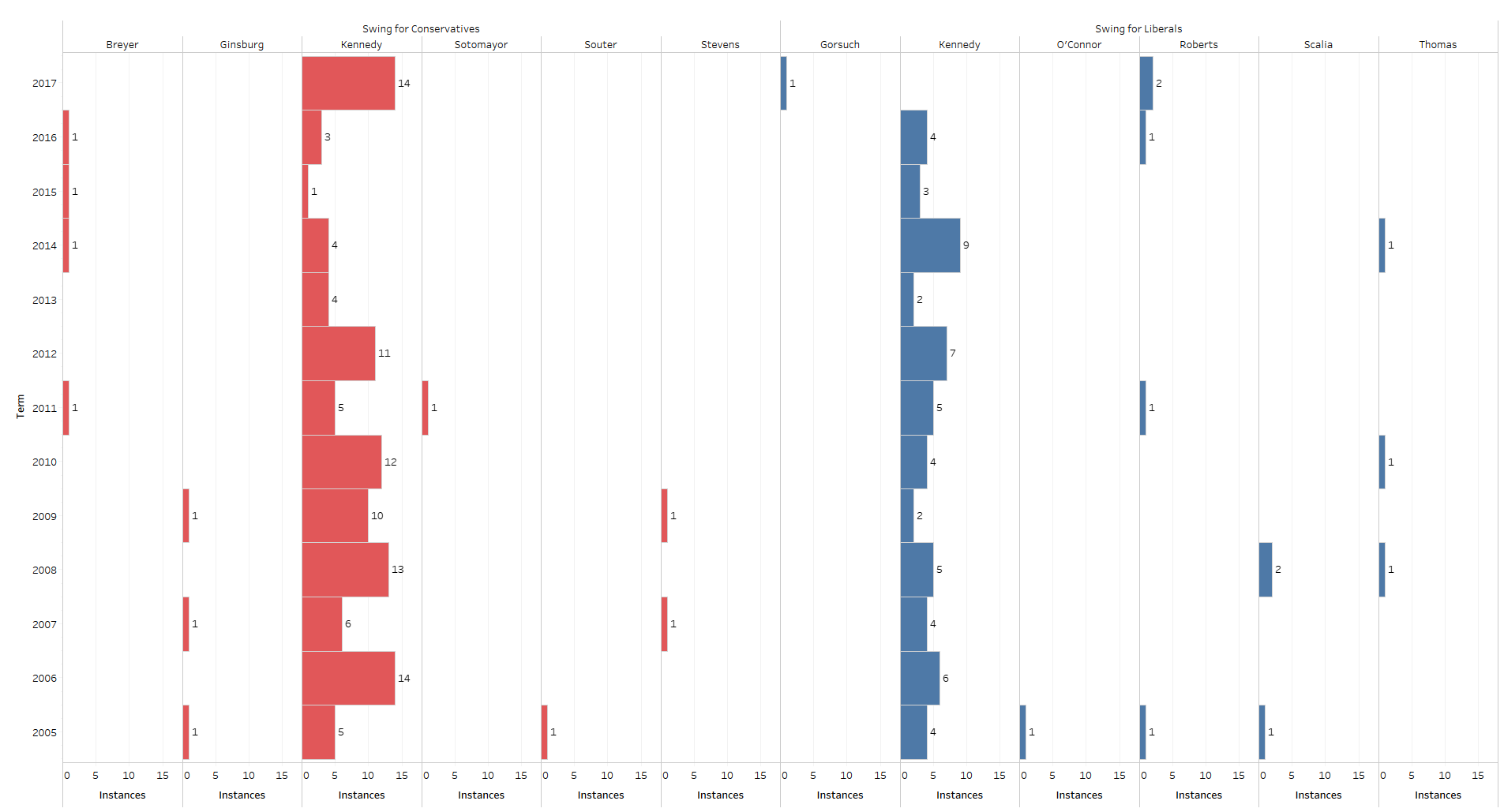 For the purpose of this post, O’Connor/Alito, Scalia/Gorsuch, Thomas, Roberts, and Kavanaugh are coded as conservative justices. Kennedy is not treated as a conservative or liberal justice but rather as a potential swing vote in either direction. Souter/Sotomayor, Stevens/Kagan, Ginsburg, Breyer, are coded as liberal justices (this left-right dichotomy is captured by multiple different metrics including Martin-Quinn Scores). A swing justice is counted when four conservative or four liberal justices are in the majority along with one member of the opposite ideological grouping or Kennedy who is coded as neither liberal nor conservative. The next figure shows each of the justices swing votes between the 2005 and 2017 Supreme Court terms.