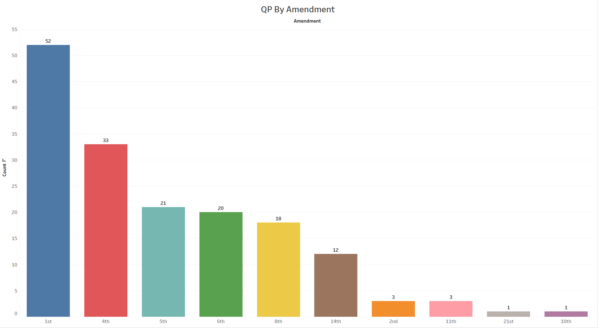 First Amendment cases were most prevalent and also surrounded a number of different issues. The majority of First Amendment cases were speech related, but a number also dealt with voting rights, campaign finance, freedom of religion, retaliation claims, and other issues. Fourth Amendment QPs were the second most frequent and almost all of them looked at the reasonableness of police searches. Under Fifth Amendent QPs, most dealt with due process, Sixth Amendment QPs tended to deal with the right to counsel and to a jury trial, and Eighth Amendment QPs often examined standards for cruel and unusual punishment.