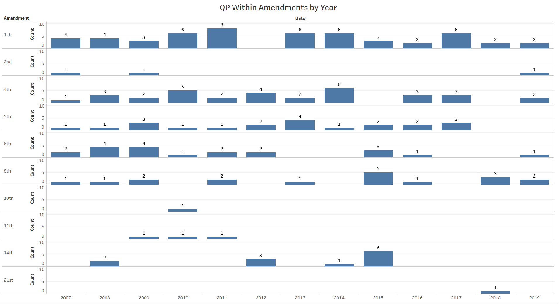 Based on the large number of First Amendment QPs in general, it should come as no surprise that most terms had more First Amendment QPs than QPs dealing with other amendments. Fourth Amendment cases were spread out across most terms as well though the year with the most Fourth Amendment grants was 2014. The most Eighth Amendment grants in a year were five in 2015, while the Court took twice as many 14th Amendment cases in 2015 as it did in any other calendar year since 2007. The 2019 term already has QPs looking at issues under the First, Second, Fourth, Fifth, and Eighth Amendments.