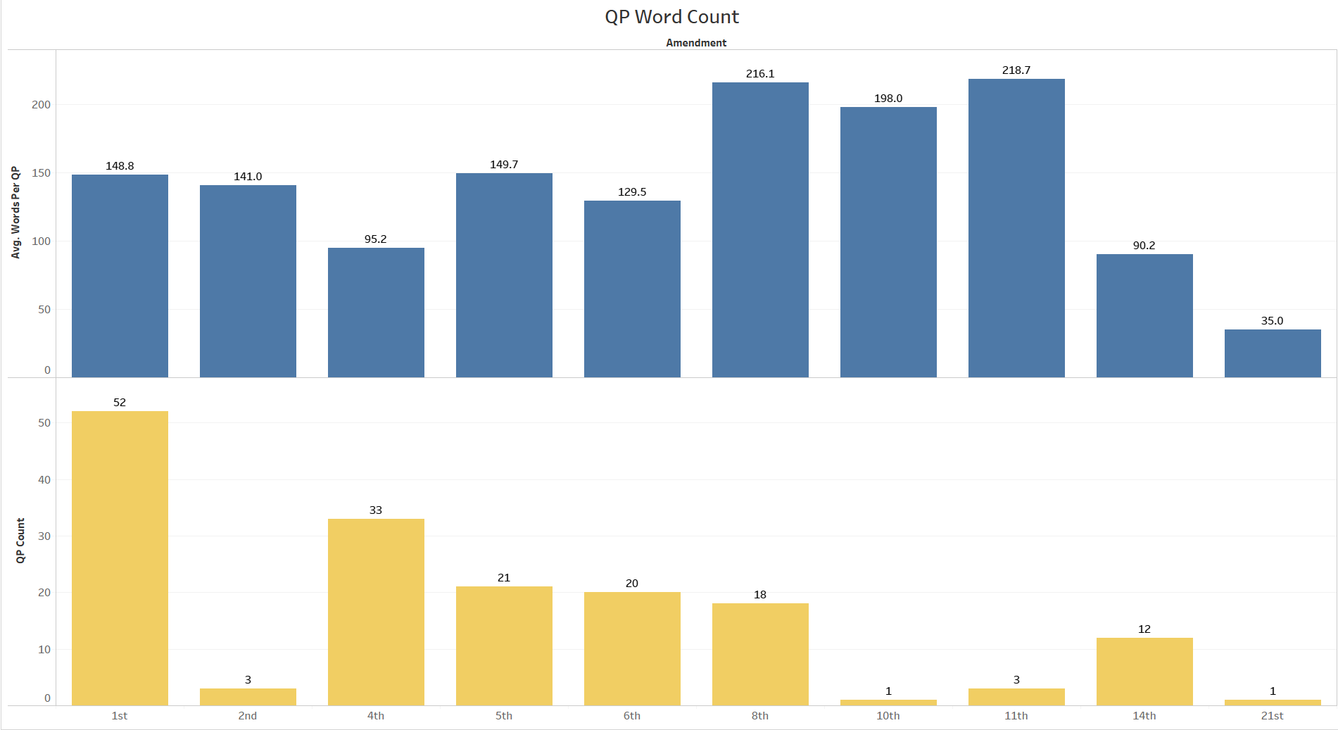 One other interesting aspect of these QPs is that some varied considerably in length depending on the Amendments they examined (length was measured by the QP word count taken from the entire length of the QP considered by the Court). While it is difficult to make general claims about the length of QPs dealing with Amendments the Court hears infrequently such as the Second Amendment, amendments examined in a greater number of QPs give us a better sense of the typical length for such QPs. In the next figure the top graph has the average word counts by the Amendment that was the topic of the QP and the bottom graph has the count of QPs by Amendment.
