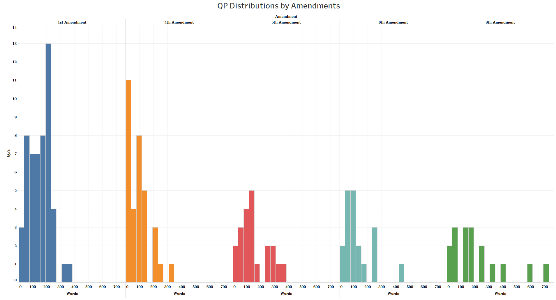 The differences in these distributions help to explain why Eighth Amendment QPs had a significantly larger mean. While most Fourth Amendment QPs were on the short side at under 40 words, the largest bin of First Amendment QPs had just less than 200 words. Eighth Amendment QPs were spread out but several were 400 words or more. The longest QP was for the Eighth Amendment case, Madison v. Alabama, which had 691 words. On the other end of the spectrum, the Court had three QPs with 14 words each, including the QP for an Eighth Amendment case the Court will hear next term: Kahler v. Kansas.