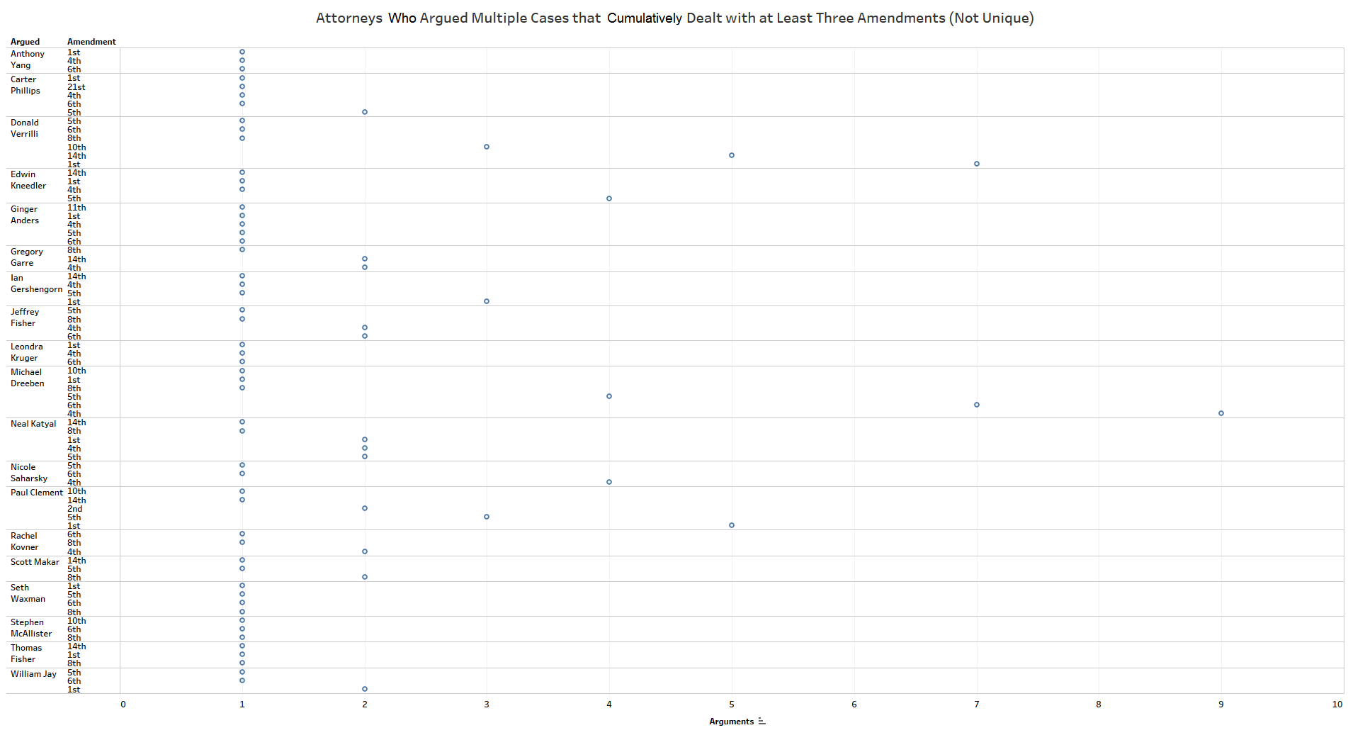 We can split these attorneys by several case characteristics. The next figure looks at attorneys with arguments in cases that dealt with at least three different Constitutional Amendments. This list includes sixteen attorneys.
