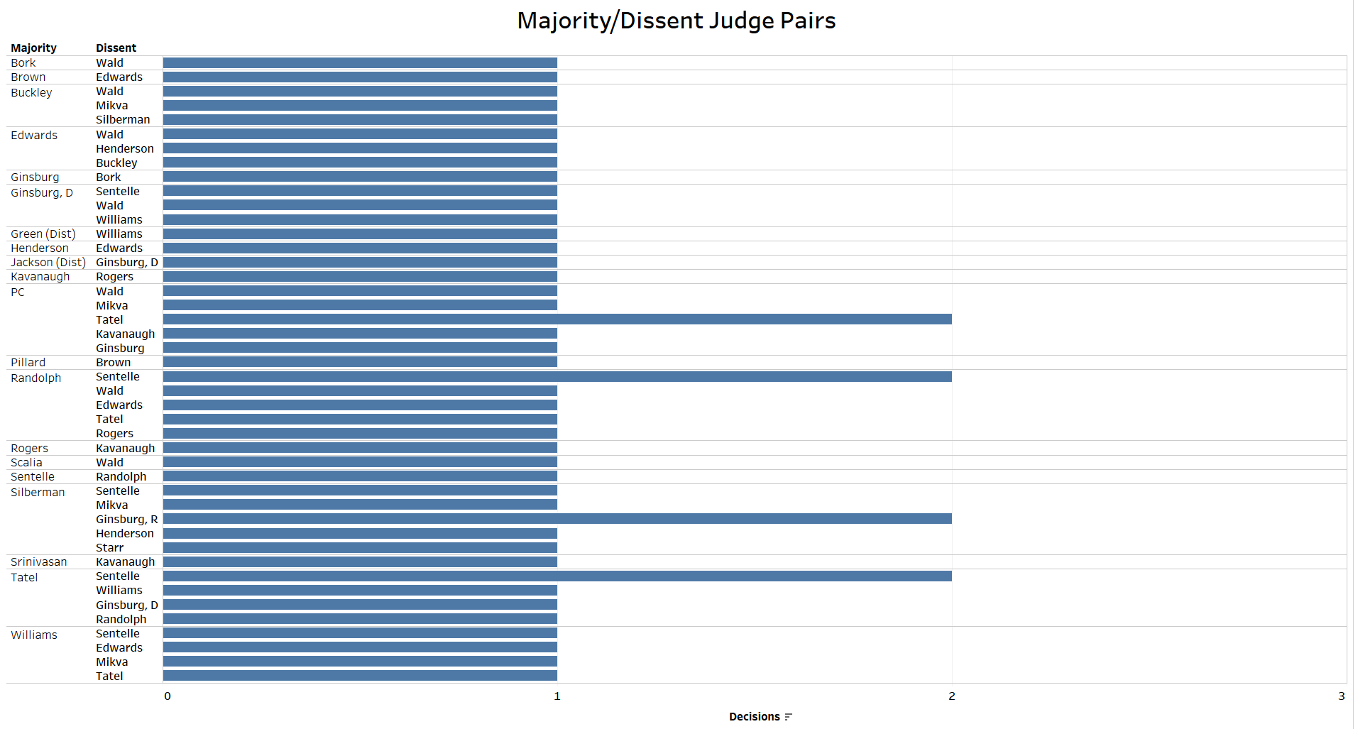 Another way to break these relationships down is by majority/dissent judge pairs in cases the Supreme Court later took up on cert. Of the judge pairs, only three had more than one case that the Supreme Court later decided. “PC” cases are per curiam decisions where no D.C. Circuit Judge was listed as a majority author.