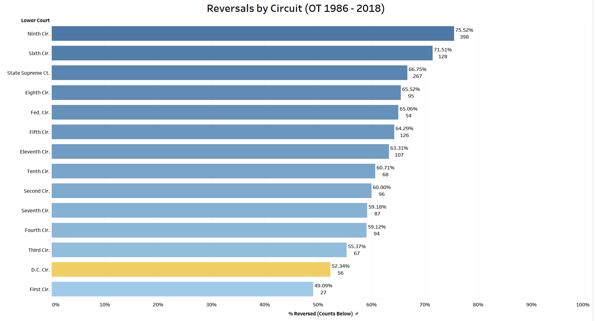 One area where the D.C. Circuit is unique is in Supreme Court reversals. D.C. Circuit decisions have been reversed the second least frequently of decisions from any circuit over this period.