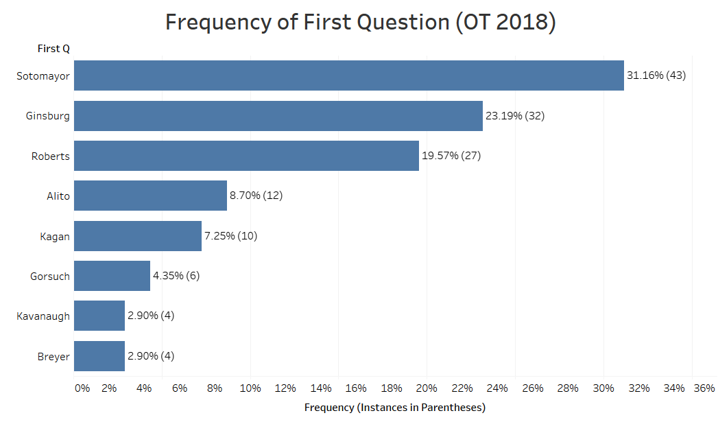 Sotomayor led the way by asking the first question over 31% of the time. She was followed by Ginsburg who asked the first question over 23% of the time and Roberts who asked the first question just over 19.5% of the time. The other justices had much lower frequencies of asking the first question.