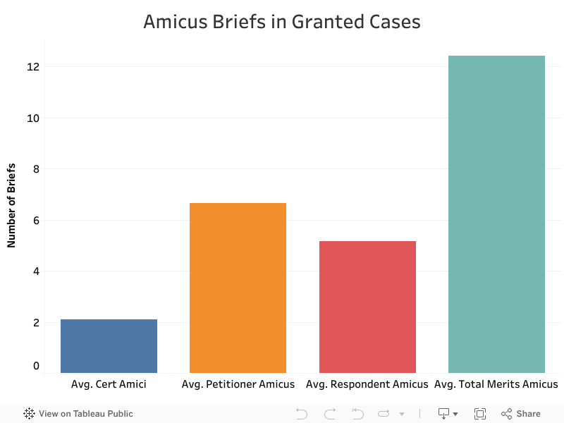 Cases this term have averaged a high number of cert petitions both at the cert stage and on the merits. Case averages and average by party type are shown below (Note that these averages are incomplete as groups continue to file amicus briefs in cases not yet argued).