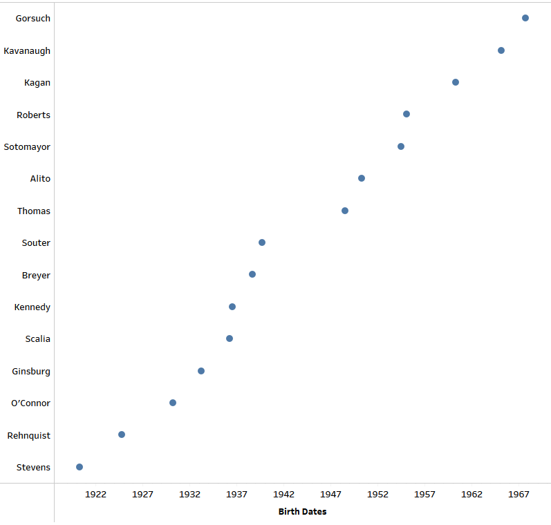 Between OT 1990 and OT 2019 this means that a number of justice compositions based on age were never in 5-4 majorities together when the older justices were in dissent. These include:
