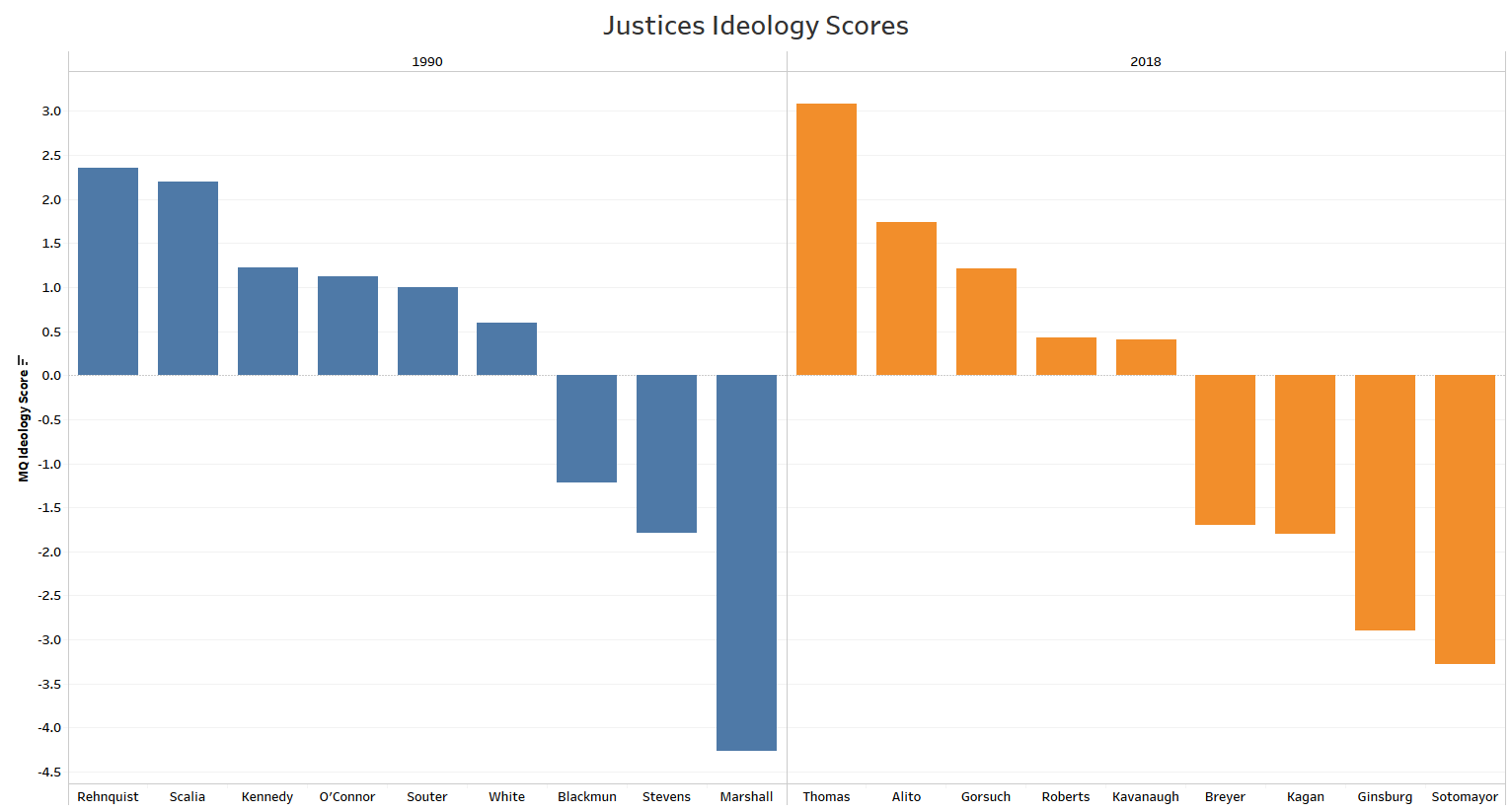 The last time this happened was in OT 1990 when four cases were decided by 5-4 votes with the coalitions split by age. In OT 1990, these justices were Kennedy, Scalia, O’Connor, Rehnquist, and Souter in the majority and White, Blackmun, Stevens, and Marshall in dissent. These coalitions make much more sense ideologically than split in Georgia v. Pubic.Resource.Org as the 1990 coalitions have generally more conservative justices in the majority and generally more liberal justices in dissent as shown below.