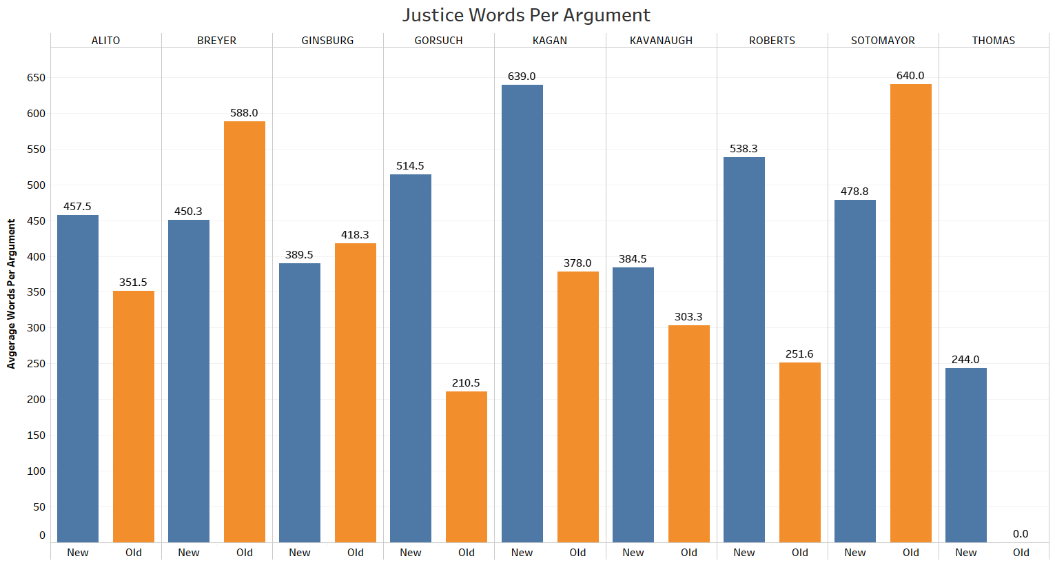 The two main metrics I used to track oral argument participation were words per argument and words per turn. Both justices and attorneys averaged increased numbers for both measures with the new arguments.