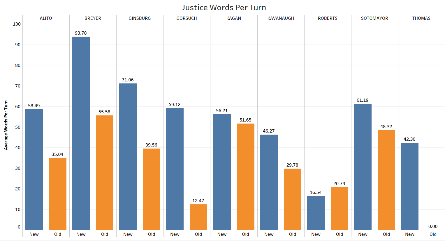 All justices except for Roberts are speaking more words per turn in the new format. Roberts’ decrease is directly related to the number of additional turns he now takes to ensure the telephonic arguments run smoothly.