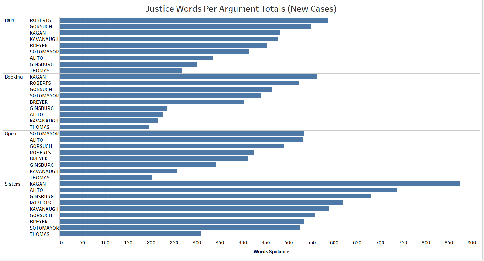 Sotomayor and Roberts spoke most of the justices in one argument each. While Thomas participated in each of the four new format arguments he spoke least of the justices in each of them, thereby at least somewhat maintaining his low profile. Justice Ginsburg, joining oral arguments from her hospital bed after being treated for a gallbladder condition, spoke third most of the justices in the Little Sisters of the Poor arguments and spoke the second fewest words in the Barr arguments after Justice Thomas.