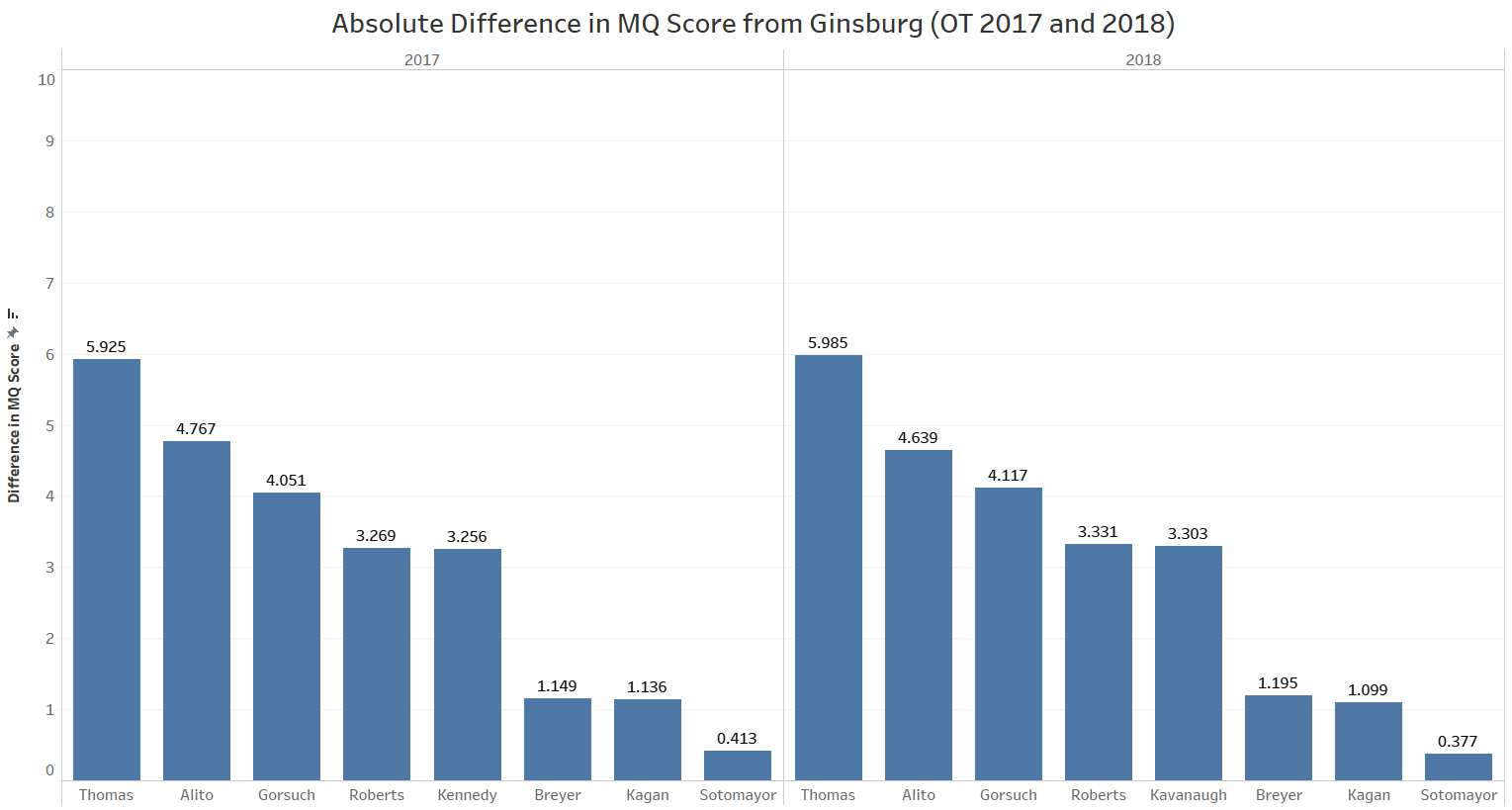 When we look at Ginsburg’s MQ Score differences from the other justices on the Court for the past two terms with released scores, OT 2018 and OT 2019, we see her proximity to the liberal justices and distance from the conservative justices — including from the three conservative justices most often in the Court’s majorities.