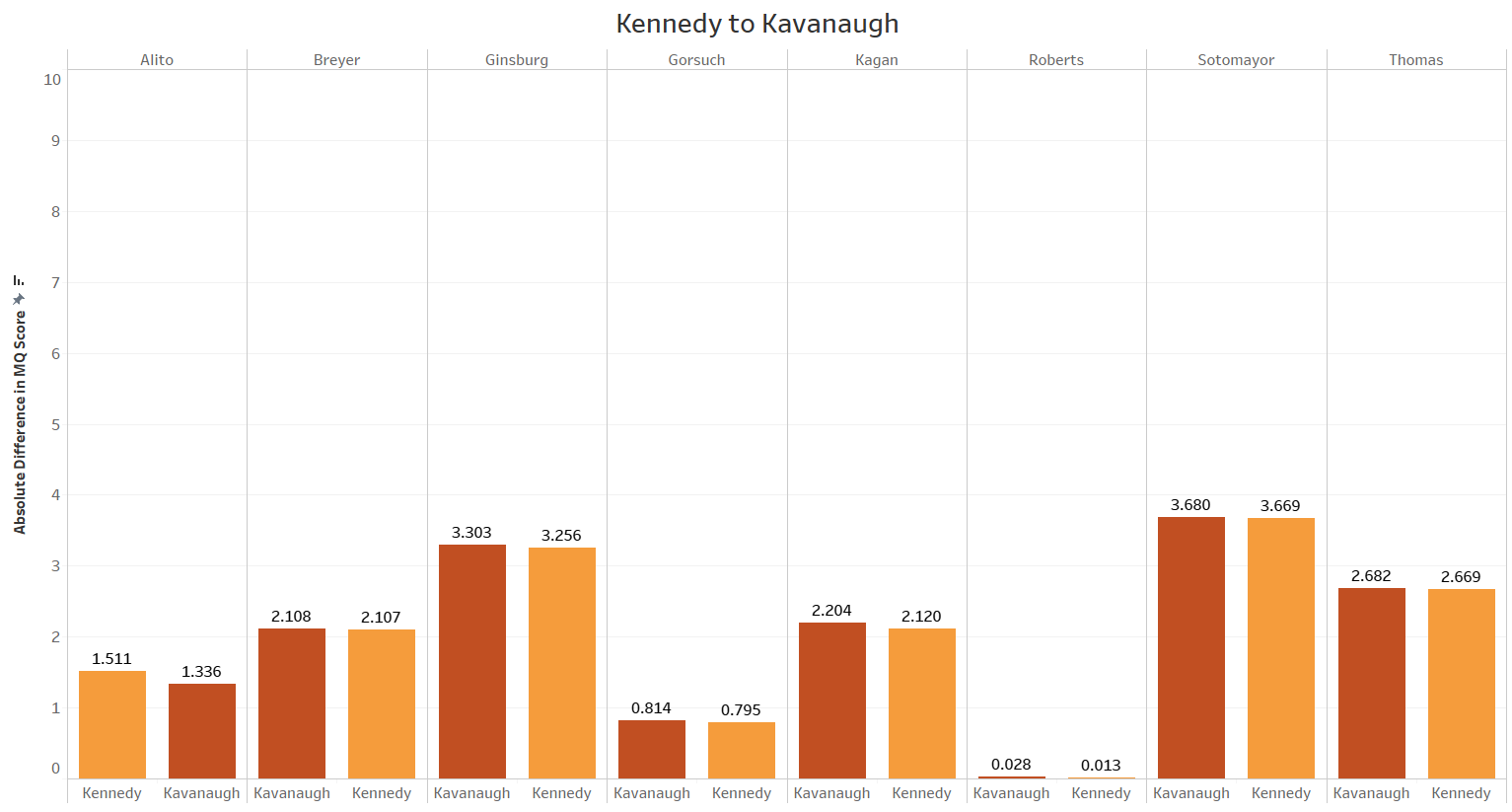 A comparison will help underscore the importance of the value differences between Marshall, Thomas, and each of the justices. The next chart shows the transitions in score differences between Justice Kennedy in his final year on the Court and Justice Kavanaugh in his first year. Justice Kennedy, was in the majority 92% of the time in his final term. He also tended to vote quite conservatively that term as evidenced by the fact that he voted with the conservative justices in all 14 5-4 decisions that broke down along ideological lines that term. Kavanaugh was in the majority 88% of the time in his first term on the Court and was in seven conservative majorities in 5-4 decisions compared to the one occasion where he was the swing vote for the liberal justices. Not surprisingly then, Kennedy’s MQ Score differences in his final term on the Court tracked quite similarly to Kavanaugh’s in his first term on the Court.