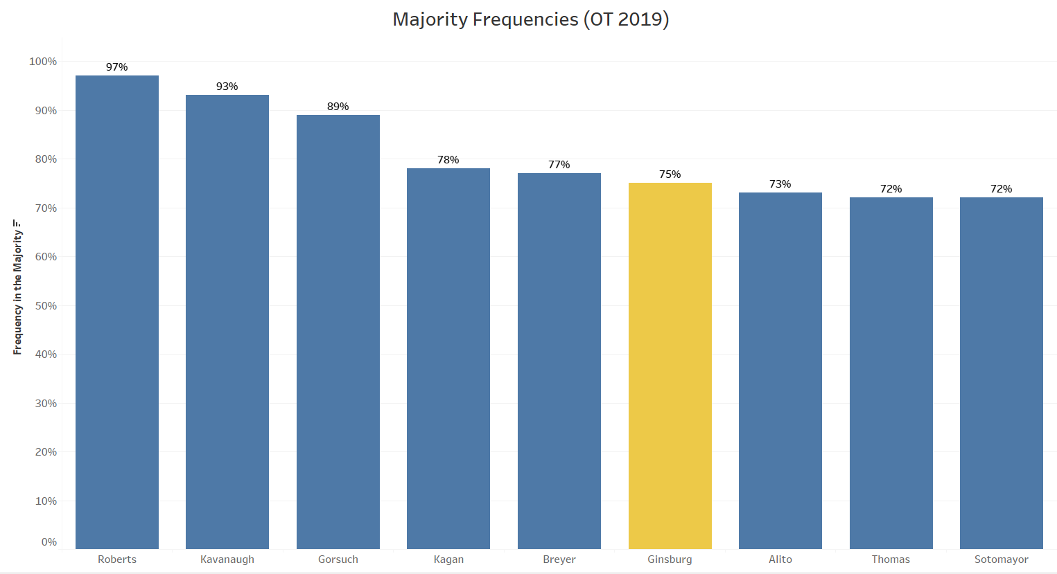 Where does Ginsburg fit into all of this? Like Marshall, Ginsburg is a liberal justice on a predominately conservative Court. Her frequency in the majority from this past term is on the low end for the Court and is between those of Marshall in his last term on the Court and Thomas in his first.