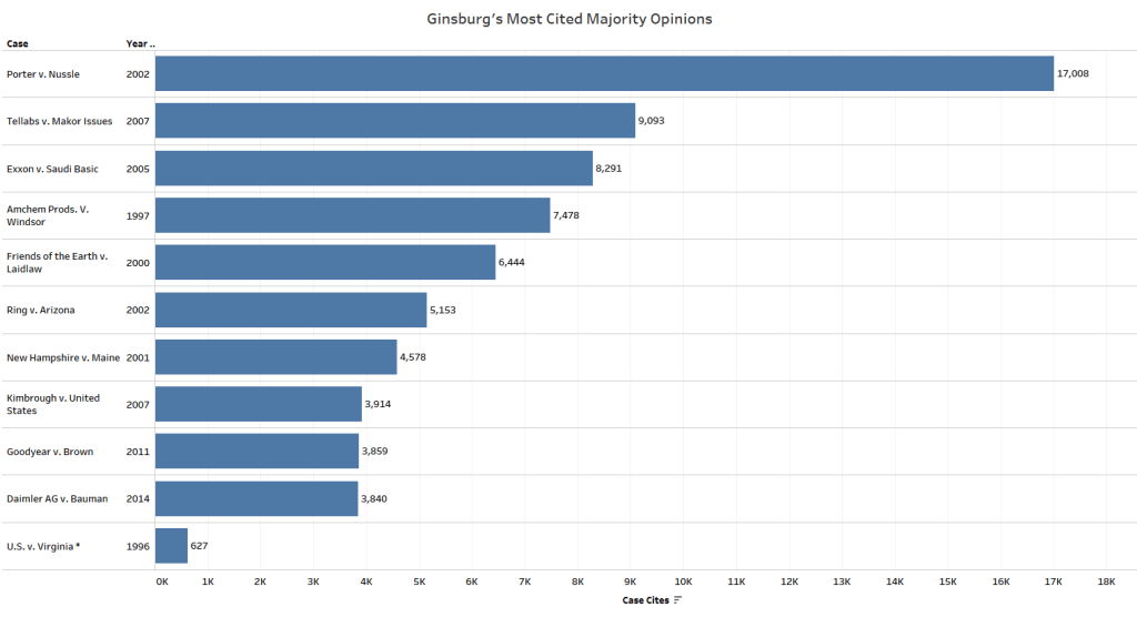 Ginsburg was prolific in her opinions authoring the majorities in cases such as United States v. Virginia, Daimler AG v. Bauman, and Ring v. Arizona. The following graph charts Ginsburg’s top cited cases on Westlaw. U.S. v. Virginia was not on the top cited list but was included as a reference point given the case’s notoriety.