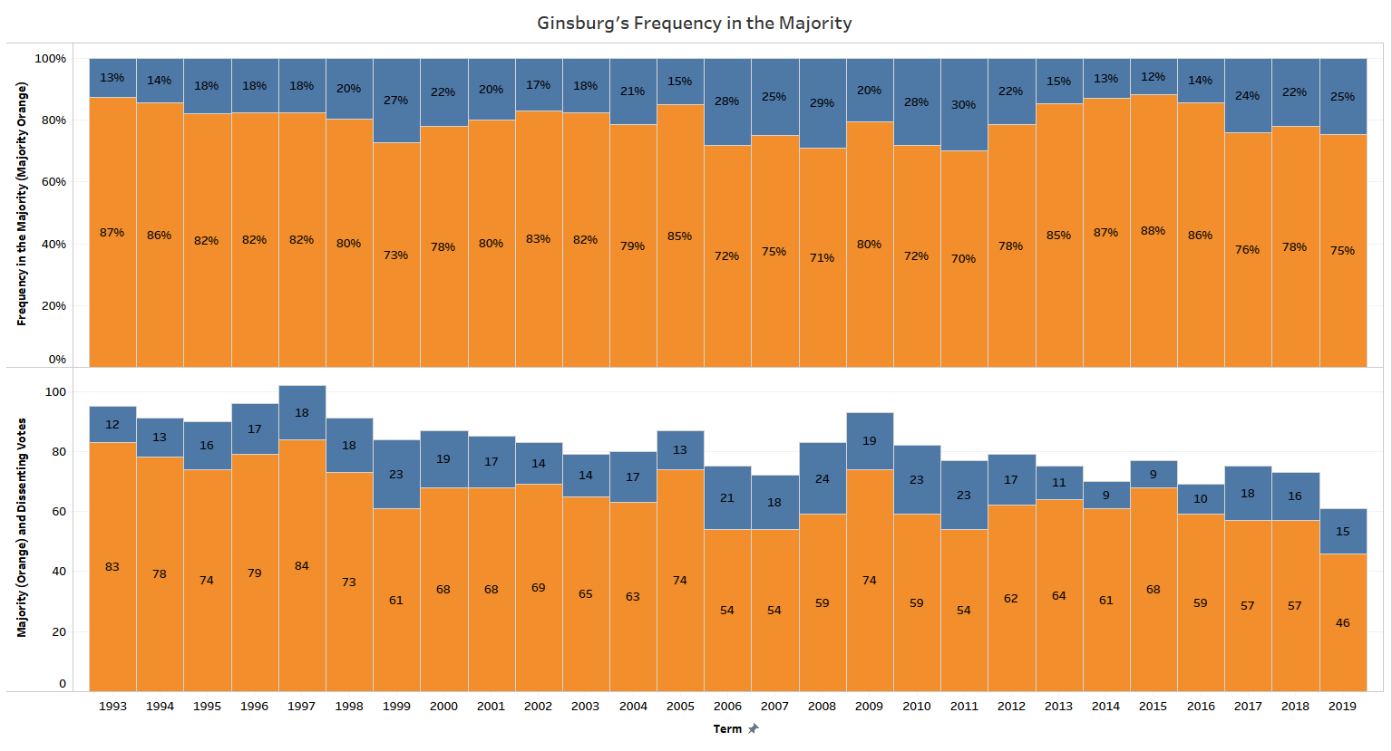 While Ginsburg never reached frequencies in the majority like Chief Justice Roberts’ frequency last term at 97%, as a consistent member of the liberal minority on the Court, Ginsburg’s percentage generally hovered around 80% and ranged from 70% in 2011 to 88% in 2015. The graph below shows the percentages for the majority frequencies on top and the number of votes in the majority and in dissent below.