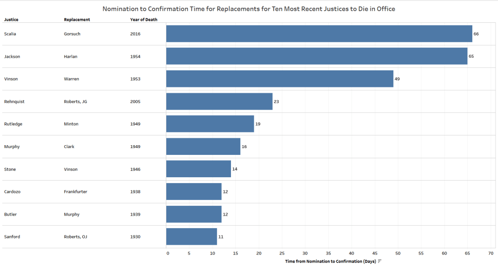 Note that Scalia and Rehnquist were the only two justices to pass in the 2000’s and the last justice to pass in office before Rehnquist did so prior to 1960. Notice that while not recent nominations, several of these justices mentioned above were confirmed within a month of nomination.