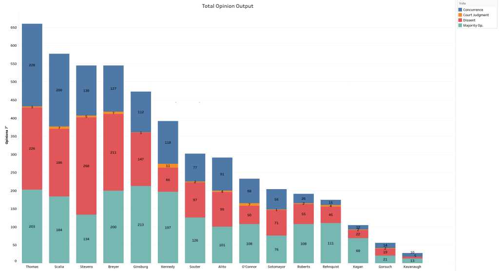 She wrote far fewer dissents over this period than Justices Thomas, Scalia, Stevens, and Breyer and authored fewer concurrences than these justices as well.