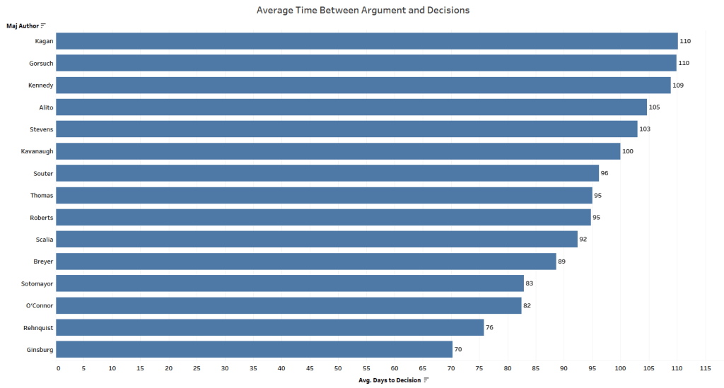 Ginsburg was also the quickest authoring justice when looking at the average time between oral arguments and signed decisions. The graph below looks at average time by justice from the 1993 through 2018 terms. The 2019 term was excluded due to the nuance of remote arguments in May.