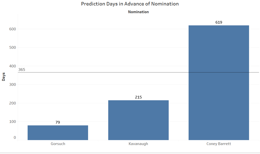 The total time between predictions and nominations for the three was 913 days or exactly 2.5 years (or more than half of the time Trump has been in office). There is no surefire way to gauge that any such predictions will be accurate but this is at least a modicum of evidence that empirical methods can be helpful predictors in such situations, especially when machinations and decision making play out in somewhat consistent fashions.