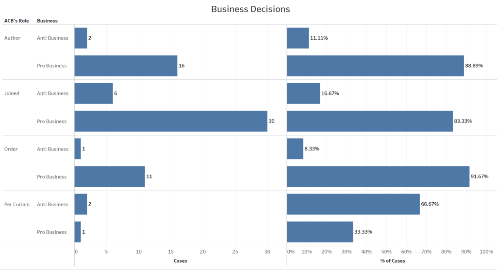 Judge Barrett’s authored and joined opinions and orders in these cases also had and have real world implications. One area that many people are concerned with from a variety of angles is her business decisions. These were coded broadly as decisions affecting business liability, contracts, and deals.