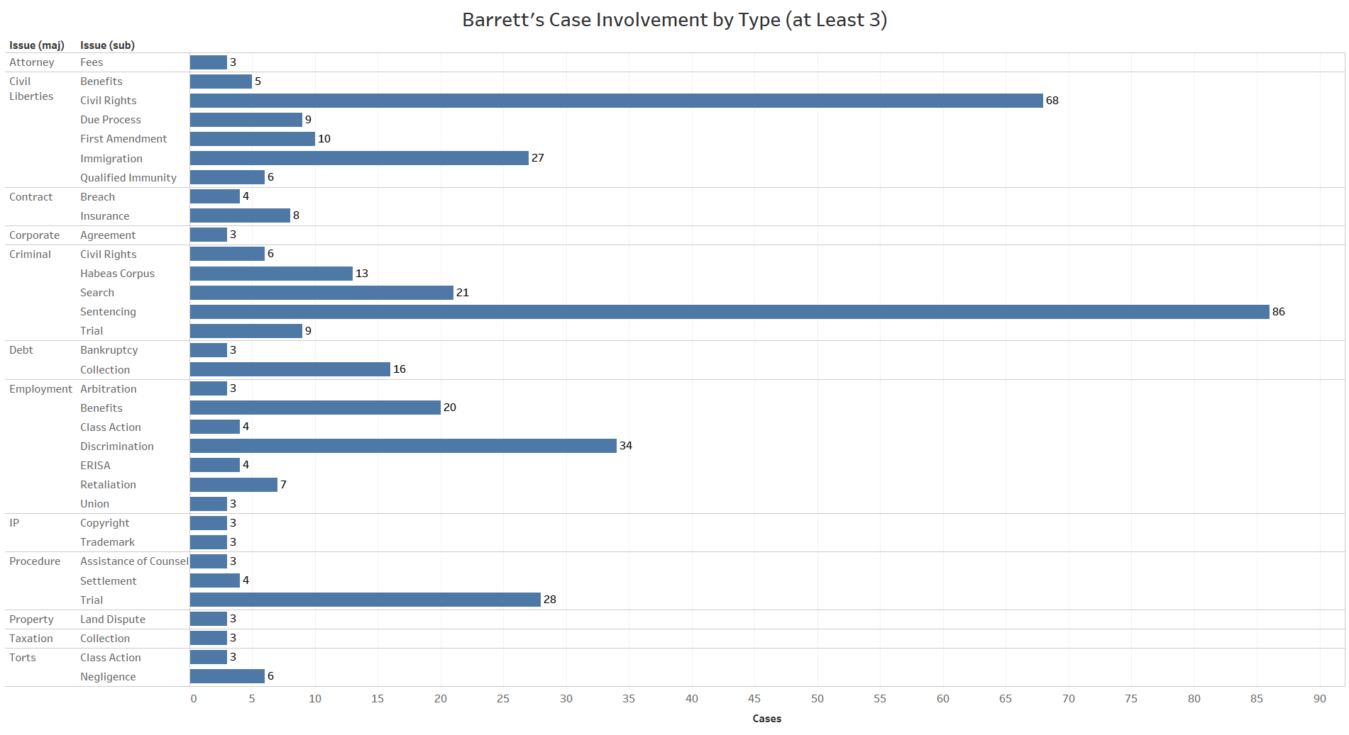 Following mainly the coding for issue area from the United States Supreme Court Database, Barrett’s cases were coded into general and specific issue areas.** The first purpose of this coding was to observe the split in case type of all of the cases that Barrett helped decide while sitting on the Seventh Circuit.