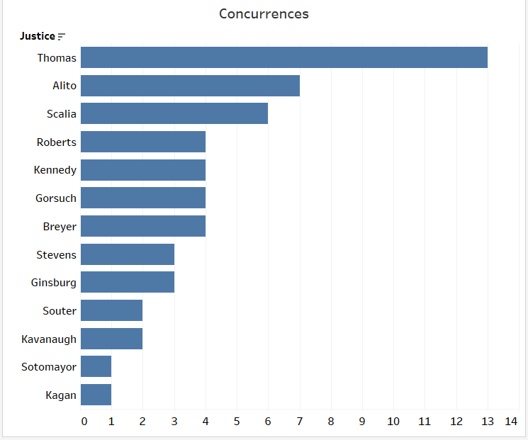 Justices in the majority often had alternative views on case law than the majority opinion writer leading to a high number of concurrences in these cases. The concurrence counts including votes and authorship are below.