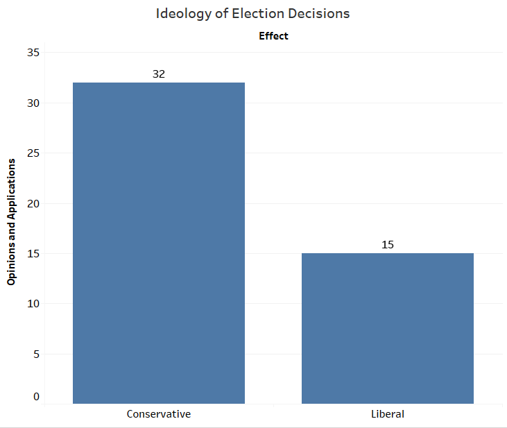 These statistics illustrate the growing divide among the Court in election related cases. They also show that if the Justices split predominately by ideology in these decisions that the conservative Justices will always come out on top. That is one explanation for why we see liberal Justices voting in the conservative direction more often than we see conservative Justices voting in the liberal direction in these cases. Along with the ideology, we see from the high level of concurrences that the Justices each have distinct perspectives and flourishes which they place on the decisions to indicate more independent views of the law in these cases. Ultimately though, with the current Court and the direction it is moving, we can expect to see additional restrictions on voting rights as more state statutes curtailing the voting population are likely to be upheld by the majority of the Court.