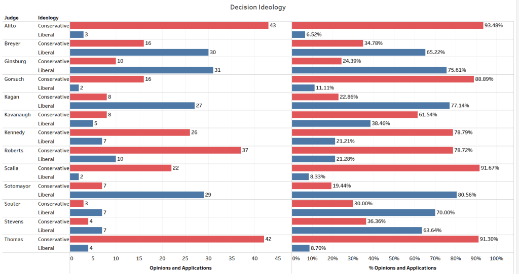 The more liberal Justices tended to vote in the conservative direction as well, at least a portion of the time. The Justice with the highest proportion of liberal votes was Sotomayor with 80.56%. This still is over 10% less in the liberal direction than the more conservative Justices voted in the conservative direction. None of the other liberal justices eclipsed the 80% marker for liberal votes. Justice Breyer has the highest fraction of conservative decisions of the liberal appointees still sitting on the Court with 65.22% liberal decisions (or less than 2/3’s liberal decisions) and 34.78% conservative decisions in these cases.