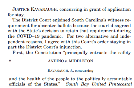 The Justices’ votes were then coded in all cases as conservative or liberal. Conservative positions deferred to state election laws in voting cases often limiting the voting population according to certain requirements. In finance related cases, conservative positions equated with those that placed fewer limits on financial contributions thus allowing more corporate interests to dominate campaign finance. There are ample examples of the different positions even in the Court’s decisions on applications for the 2020 presidential election. Justice Kavanaugh articulates this deference to state law in his concurring opinion in Andino v. Middleton.