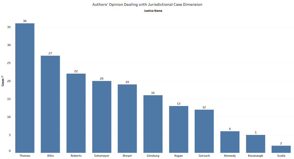 Certain aspects of this graph stick out. Chief Justice Roberts, for instance, almost uniformly applied these Rules as a majority opinion author. He is not a frequent secondary opinion author in general, but he authors more dissents relative to majority opinions in the totality of his decisions than he does in this set. Justice Kagan, similar to Roberts, also employed the Rules predominately in majority opinions she authored. Justice Breyer was much more balanced in his approach as was Justice Thomas. Justice Thomas also employed these rules in more concurrences than any other Justice. The only other justice with any regular reference to these principles in concurrences was Justice Sotomayor.