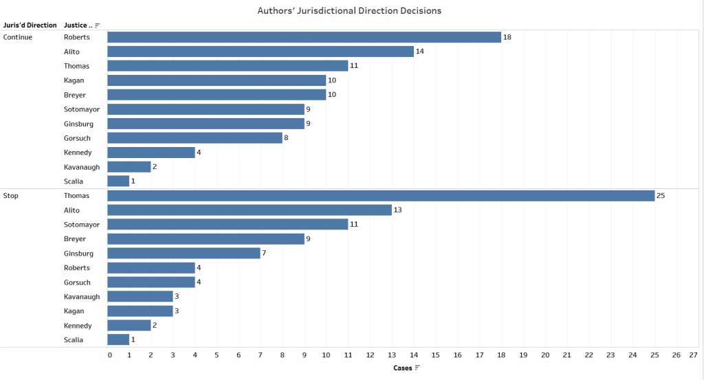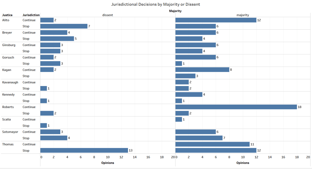 Some interesting attributes of the justices’ decisions are apparent in this graph. Justice Thomas, for instance, only argued that the Court should not rule on case merits when he brought up one of these principles in dissent. When Thomas was in the majority, however, he split fairly evenly between arguing that the Court should decide and should not decide the substance of the dispute when these principles arose. Roberts almost entirely brought these principles up in majority opinions and in these instances he was almost entirely in favor of the Court rendering a substantive decision in each case. Justice Alito was generally in favor of not reaching the substance of the dispute when he raised these issues in dissent, but he was in favor of proceeding to cases’ merits when these principles came up in his majority opinions. Justice Kagan tended to raise these principles as a majority opinion writer and both as a majority and dissenting author, we see that she tended to support the Court ruling on the merits of such cases. Other justices had fewer disparities in their application of these Rules.