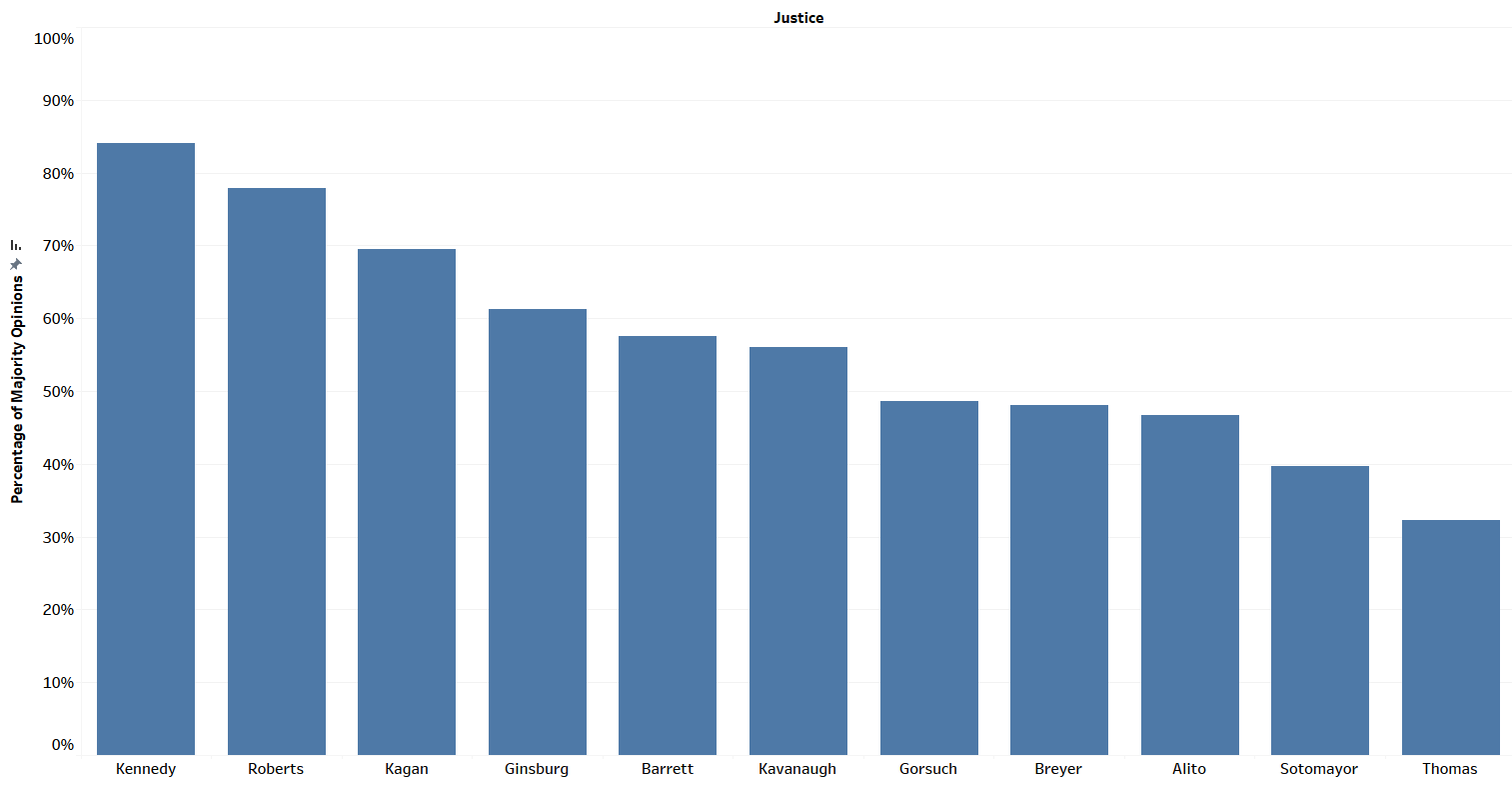 Kennedy averaged the most majority opinions of all the opinions he authored at 84%. Thomas who authored the most secondary opinions had the lowest average of majority opinions to total opinions at 32%.