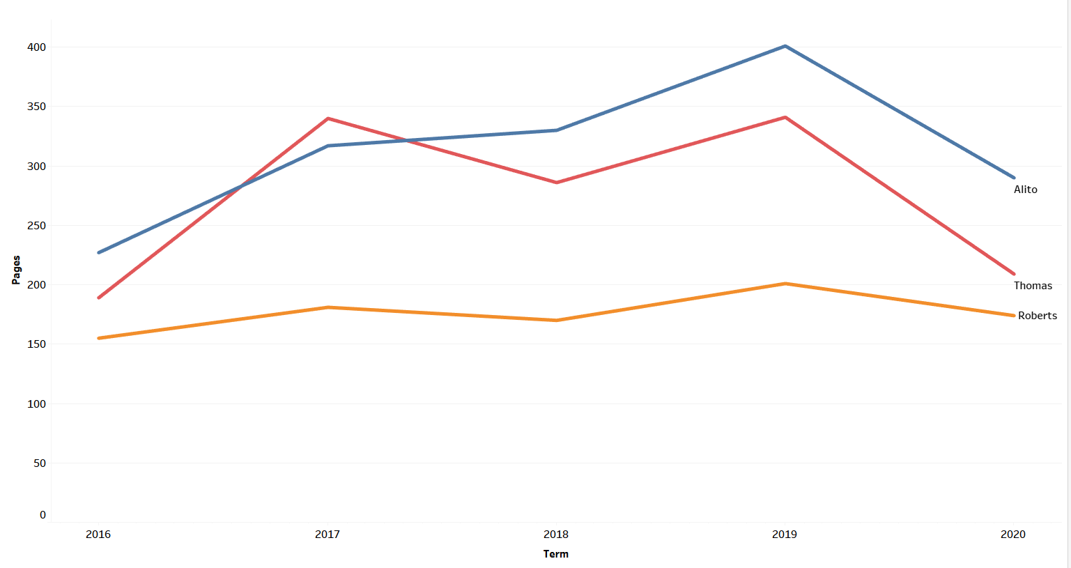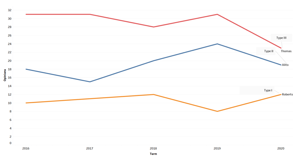 This graph fits the typology as Alito had the medium number of opinions but the most total pages. Thomas wrote the most opinions but was below Alito for total number of pages. Finally, although Roberts wrote lengthy majority opinions, he was below both Alito and Thomas for total opinions and total pages because of his few, typically pithy secondary opinions.