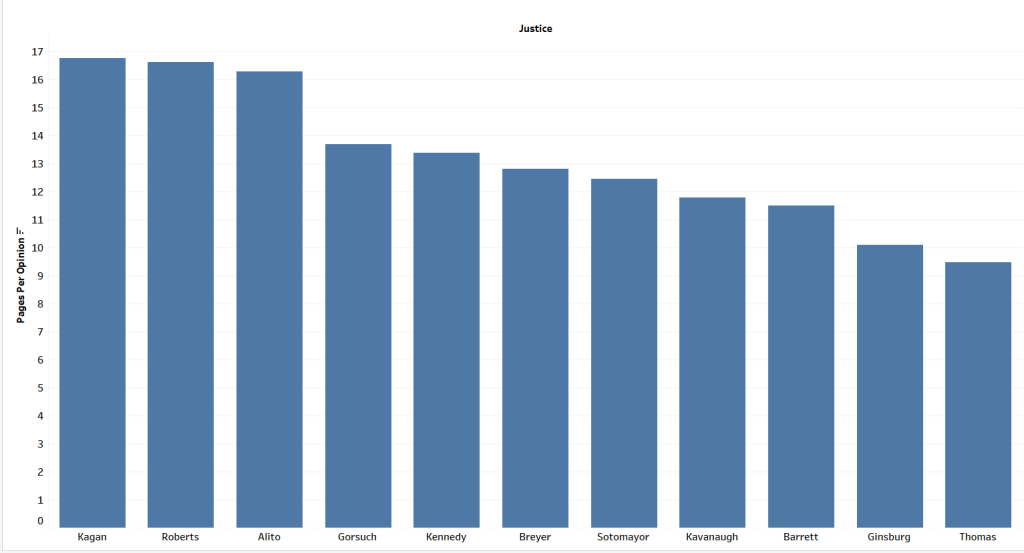 While Justices Kagan and Roberts authored fewer opinions than most of the other justices per term, they averaged the longest opinions at 16.8 pages per opinion for Kagan and 16.6 pages per opinion for Roberts. Ginsburg and Thomas had the fewest pages per opinion with 10.1 pages per opinion for Ginsburg and 9.5 pages per opinion for Thomas.