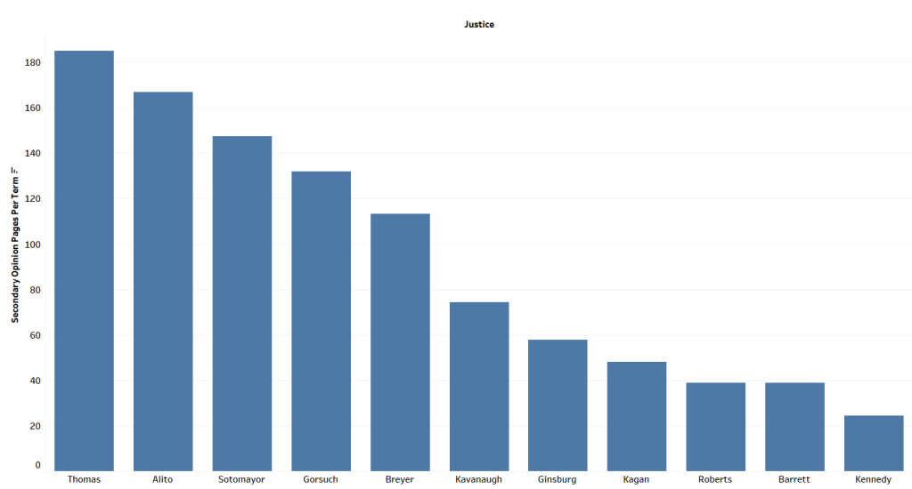 Thomas and Alito have the most pages per term with 185 and 167 pages respectively. The justices can be broken into two groups in this graph. Thomas, Alito, Sotomayor, Gorsuch, and Breyer all fall to the high end of number of secondary opinion pages per term. Kavanaugh is in the middle, while Ginsburg, Kagan, Roberts, Barrett, and Kennedy make up the second group on the low end of the graph.